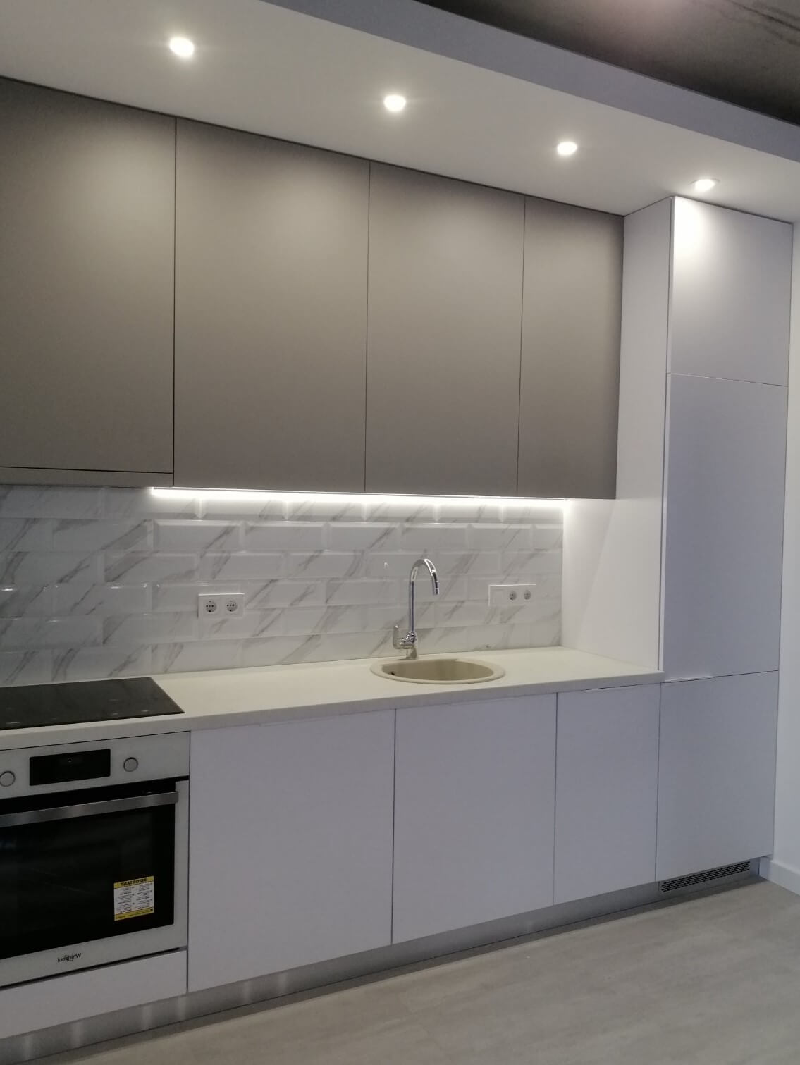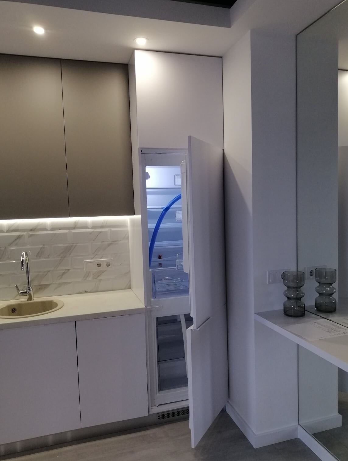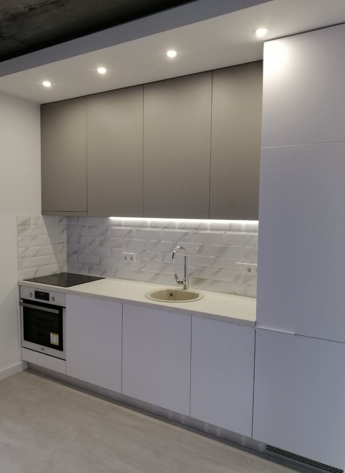Минималистичная встроенная 2-метровая кухня. Стильное и компактное решение для помещения с небольшой площадью, например, для квартиры-студии. Фасады выполнены в оттенке металлик, со скрытыми ручками. Встроенная техника скрыта от глаз.
