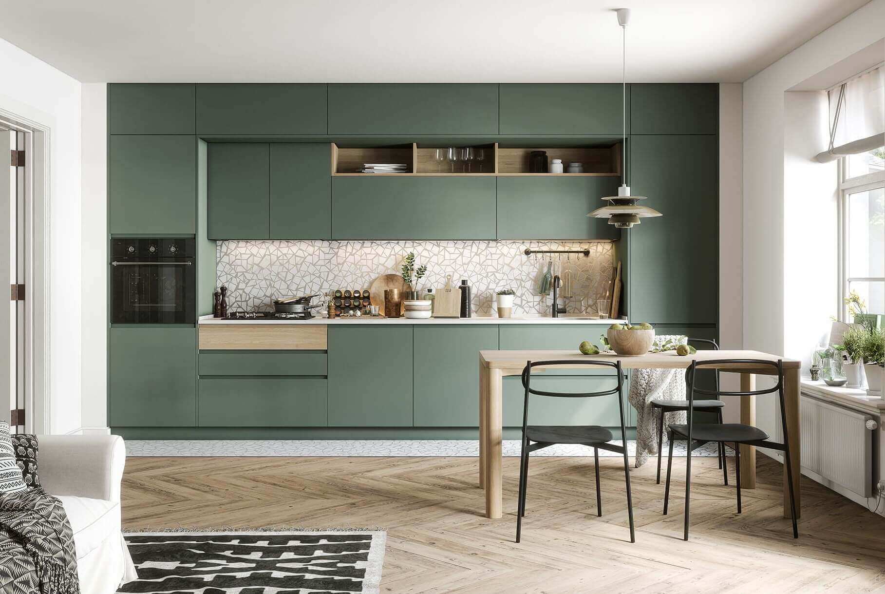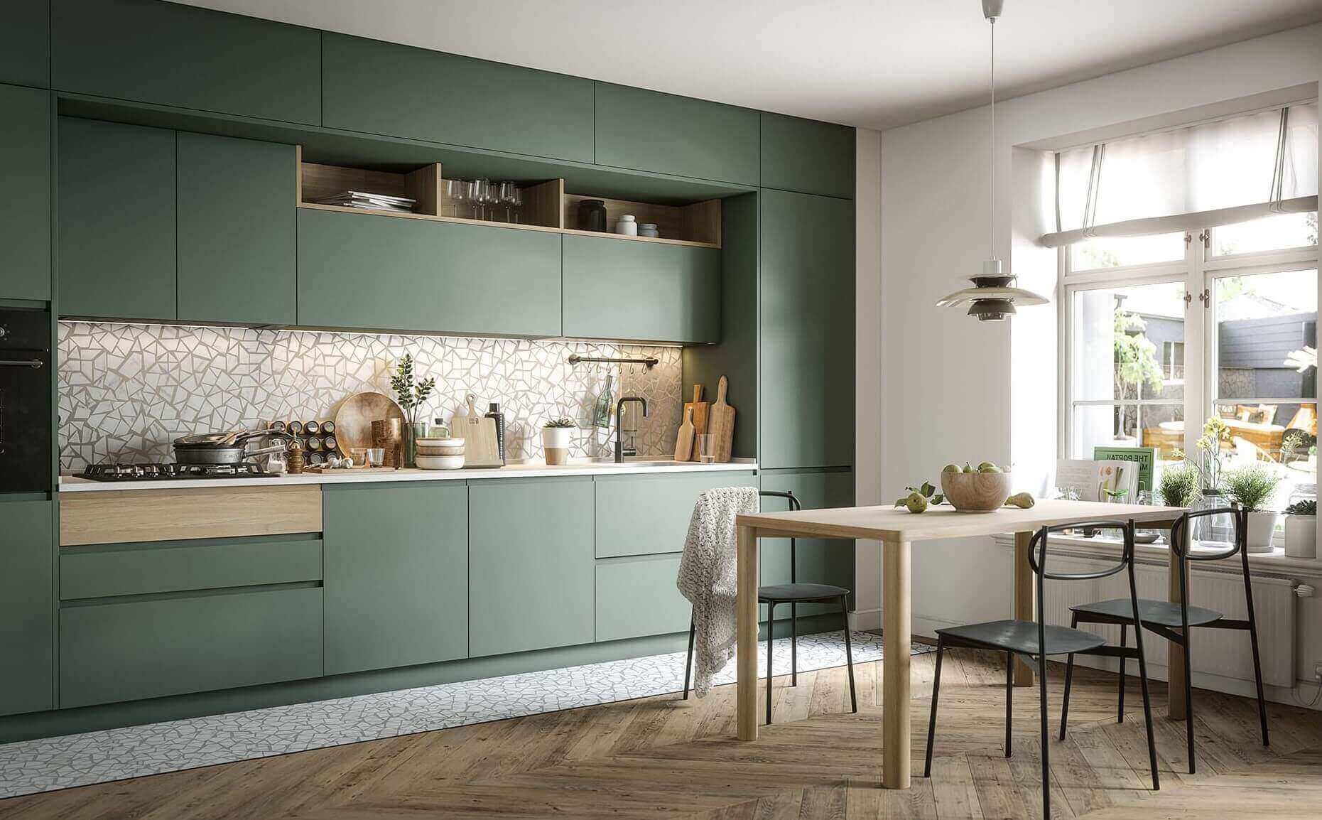 Изысканная встроенная кухня в современном стиле. Гарнитур выполнен в красивом матовом зеленом цвете, выглядит оригинально и эксклюзивно. Фасады со скрытыми ручками, встроенная техника скрыта от глаз. Есть вставки из небольших открытых полок. Кухня подойдет для современной квартиры в стиле хай-тек или модерн.